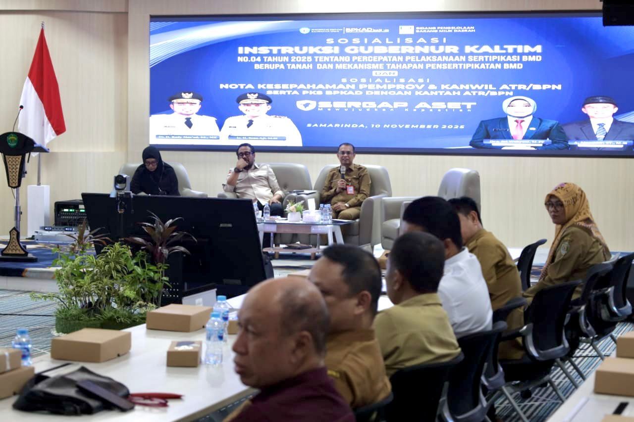 Badan Pengelolaan Keuangan dan Aset Daerah (BPKAD) Provinsi Kalimantan Timur menggelar Sosialisasi Instruksi Gubernur Kaltim Nomor 04 Tahun 2025 tentang Percepatan Pelaksanaan Sertifikasi Barang Milik Daerah (BMD) Berupa Tanah di Aula BPKAD. (Adpimprov Kaltim)