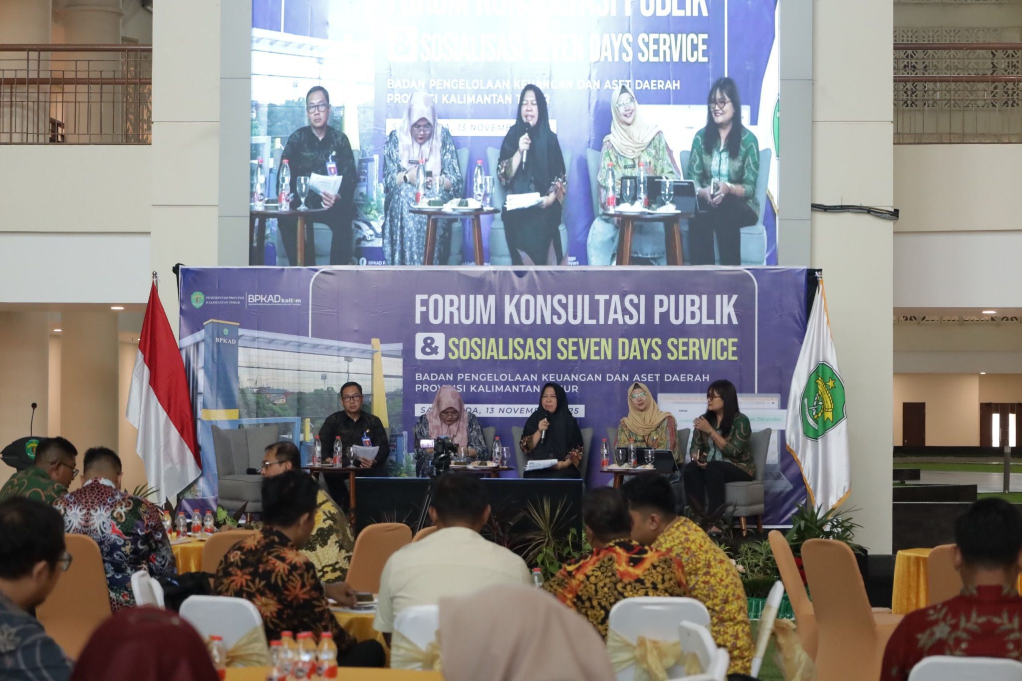 Badan Pengelola Keuangan dan Aset Daerah (BPKAD) Provinsi Kalimantan Timur menyelenggarakan Forum Konsultasi Publik dan Sosialisasi Seven Days Service (SDS) di Hotel Atlet Sempaja Samarinda, pada Kamis, 13 November 2025. Kegiatan ini diikuti oleh perangkat daerah se-Kaltim, BPKAD kabupaten/kota, BUMD, akademisi, dan sejumlah pemangku kepentingan di bidang pengelolaan keuangan daerah.