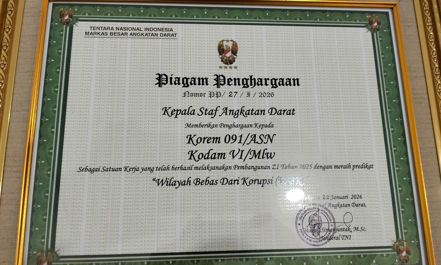 Upaya bersih-bersih birokrasi dan transparansi bukan hanya pekerjaan rumah instansi sipil, tetapi juga institusi militer. Di tengah dorongan reformasi birokrasi nasional, Korem 091/Aji Surya Natakesuma (ASN) berhasil membuktikan akuntabilitasnya dengan membawa pulang Kartika Award untuk kategori Satuan Kerja (Satker) Terbaik Peraih Wilayah Bebas dari Korupsi (WBK).