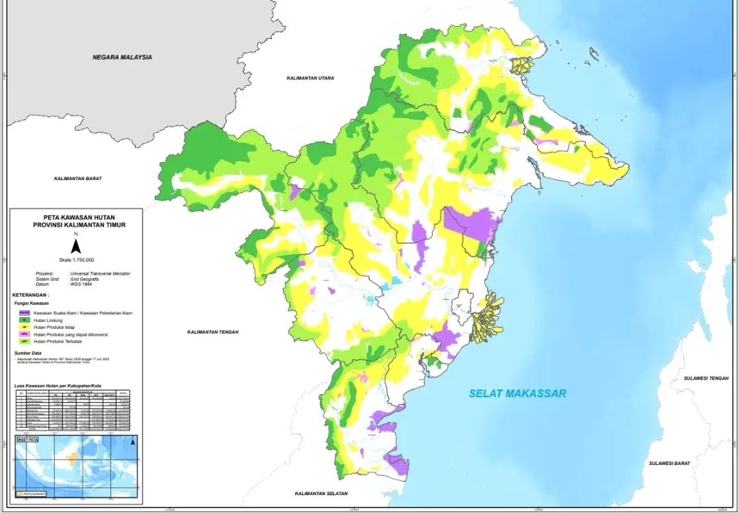Berdasarkan Keputusan Menteri Kehutanan (Kemenhut) Nomor 397 Tahun 2025 tanggal 17 Juli 2025 tentang Kawasan Hutan di Provinsi Kalimantan Timur, total luas kawasan hutan Kaltim tercatat mencapai 8.045.416,92 hektare.