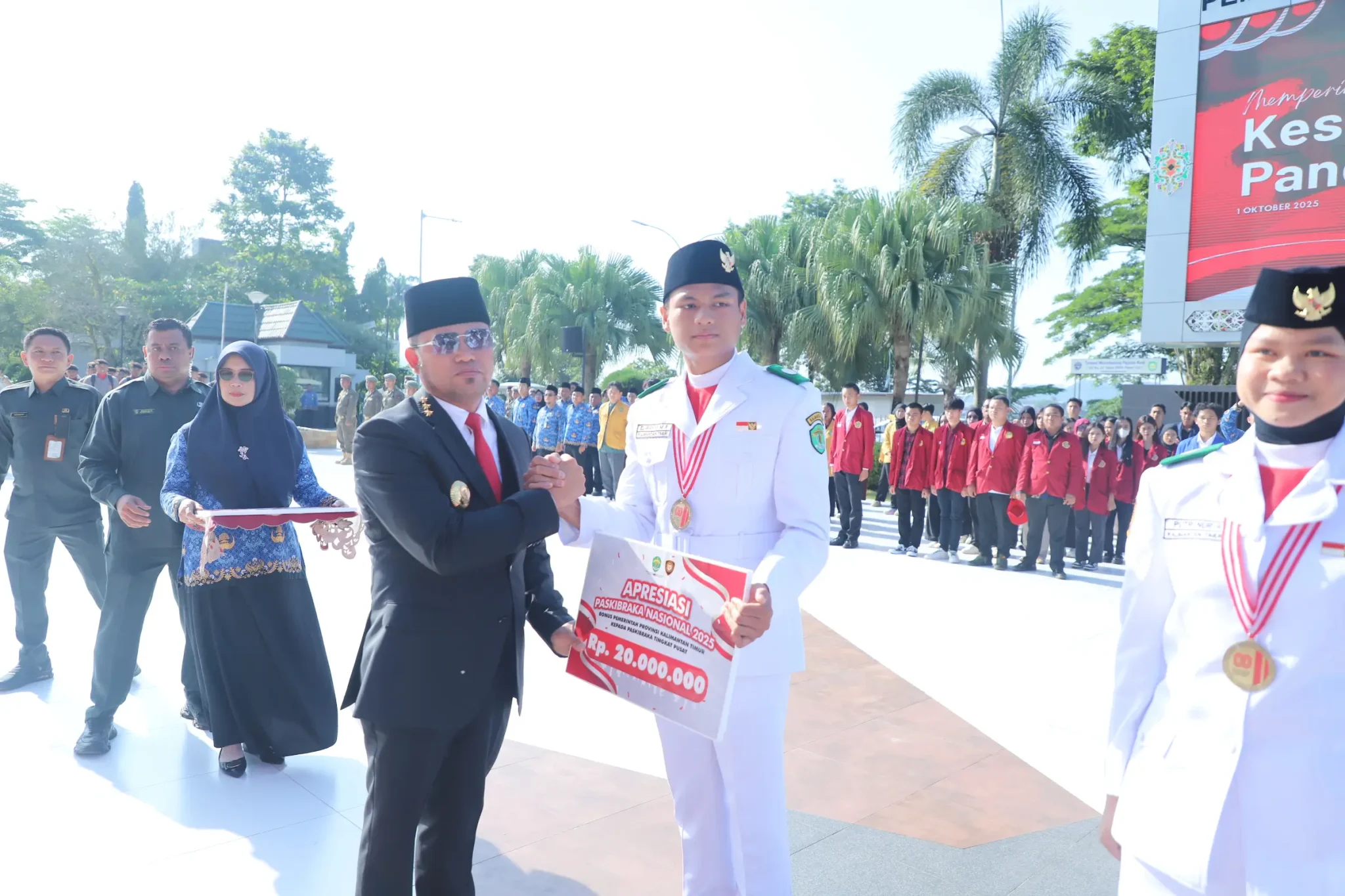 Usai pelaksanaan Upacara Peringatan Hari Kesaktian Pancasila 2025 di halaman Kantor Gubernur Kalimantan Timur, Rabu, 1 Oktober 2025, Gubernur Kaltim Rudy Masud menyerahkan penghargaan kepada dua anggota Pasukan Pengibar Bendera Pusaka (Paskibraka) Tingkat Nasional asal Kaltim.