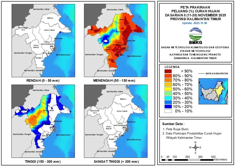 BMKG memprediksi Provinsi Kalimantan Timur akan mengalami curah hujan menengah hingga tinggi pada periode 11–20 November 2025, dengan peluang hujan lebih dari 70 persen di sebagian besar wilayah, kata Kepala Stasiun Meteorologi APT Pranoto Samarinda, Riza Arian Noor.