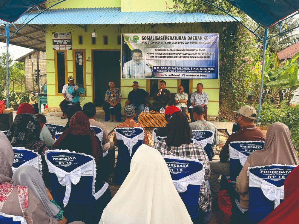 DPRD Kaltim Darlis Pattalongi sosialisasikan Perda Kaltim No. 4 Tahun 2024 tentang Trantibum dan Linmas di Handil Bakti, Palaran. Ajak warga jaga ketertiban lingkungan.