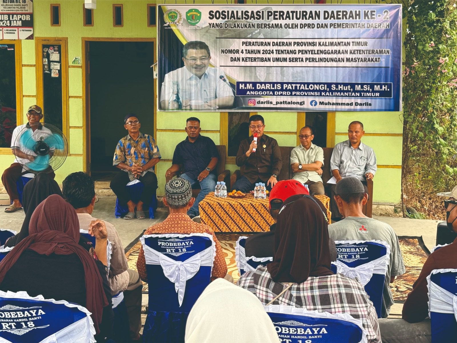 DPRD Kaltim Darlis Pattalongi sosialisasikan Perda Kaltim No. 4 Tahun 2024 tentang Trantibum dan Linmas di Handil Bakti, Palaran. Ajak warga jaga ketertiban lingkungan.